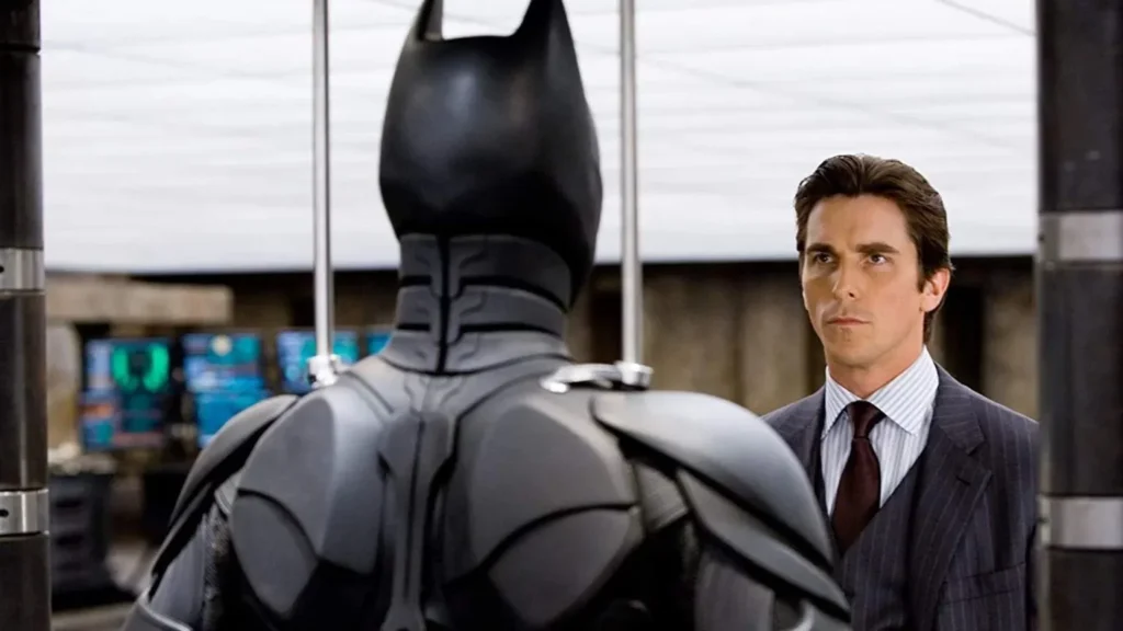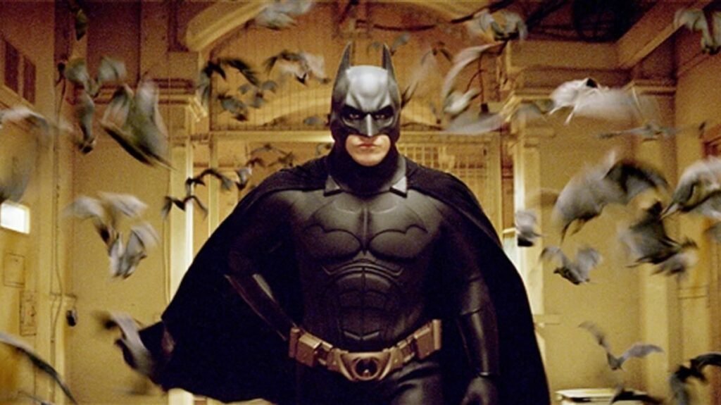 La primera película, Batman Begins, es la más cercana a Año Uno. Con esta idea de “realismo” en mente, Nolan y su coguionista David S. Goyer experimentan en busca de un universo que se aleje de las representaciones cinematográficas previas. Lo primero que llama la atención es que el Cruzado Enmascarado no aparece hasta bien avanzada la película. Se trata de una historia de orígenes en el sentido más riguroso del término.